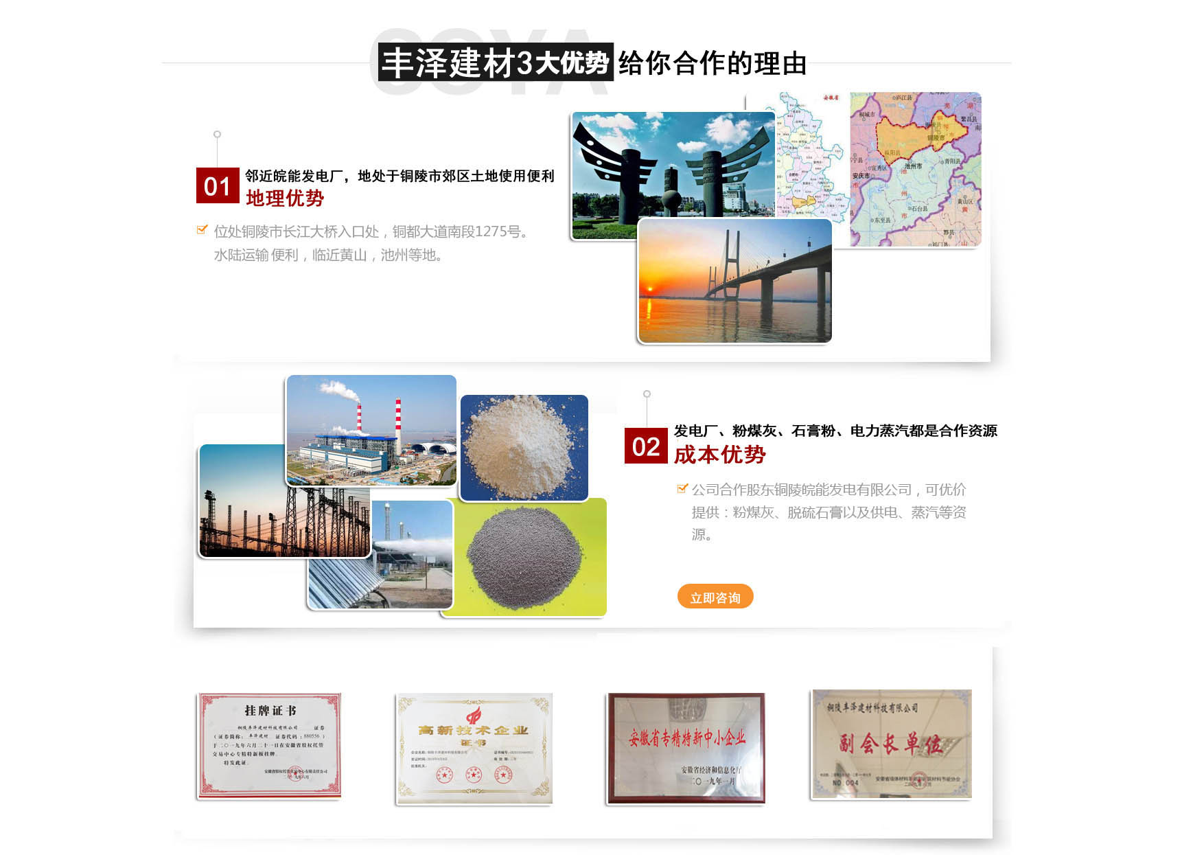 銅陵豐澤建材科技有限公司成立于2007年2月,坐落于銅都大道南段,占地4萬(wàn)平方米,公司注冊(cè)資金1000萬(wàn)元,現(xiàn)有職工百余人,是一家與皖能發(fā)電公司合作,專業(yè)從事電廠粉煤灰開(kāi)發(fā)利用的高新科技企業(yè),現(xiàn)擁有一條年產(chǎn)30萬(wàn)立方米蒸壓加氣混凝土全自動(dòng)生產(chǎn)線。 蒸壓加氣混領(lǐng)土(英文名Autoclaved aerated comcrete),也稱AAC,是以砂、粉煤灰等硅質(zhì)材料和石灰、水泥等鈣質(zhì)材料為主要原料,摻加鋁粉為發(fā)氣劑,進(jìn)行生產(chǎn)的新型墻體材料。是我國(guó)推廣應(yīng)用最早,使用最廣泛,技術(shù)最完整的輕質(zhì)保溫墻體材料之一,自問(wèn)世以來(lái),始終方興未艾,備受推崇。